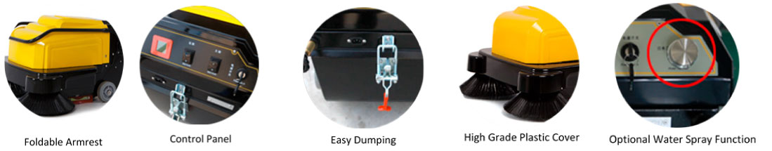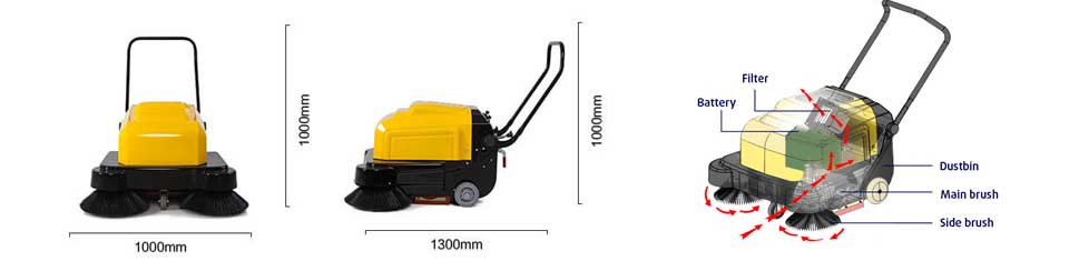 Nido Battery Walk Behind Sweeper has 2 side brushes and a main brush, also equipped with a pumping turbine, a considerable cleaning width and a powerful suction makes the ground cleanliness.