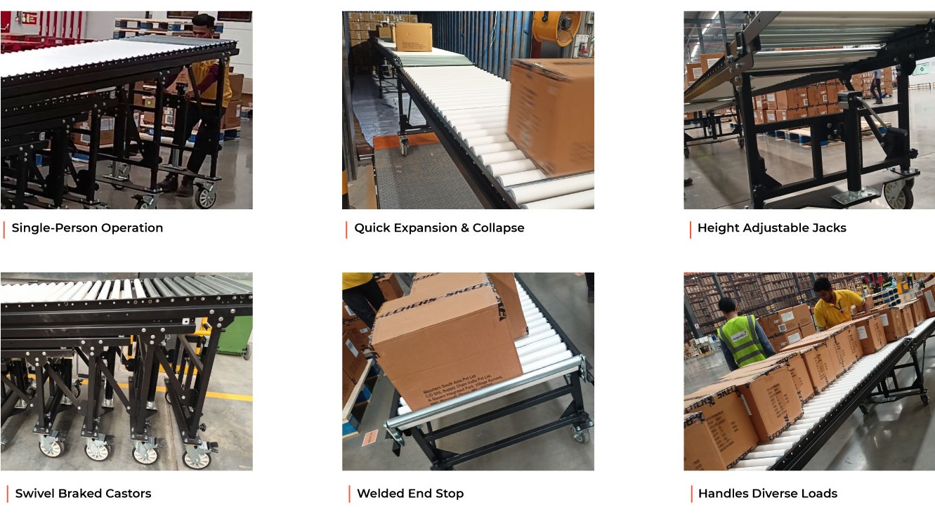Our Telescopic Gravity Roller Conveyor is an automated unloading solution which uses gravity to move items from one point to another. Several sections of gravity tracks are stacked together which can be extended up to 5 times of it’s collapsed length to automate the loading and unloading operation.